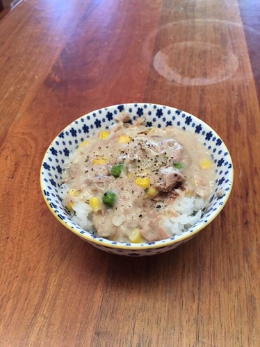 Then pop in the tuna, peas and corn mix well and simmer on low heat until warmed through. If too thick add more water, if too thin then reduce.