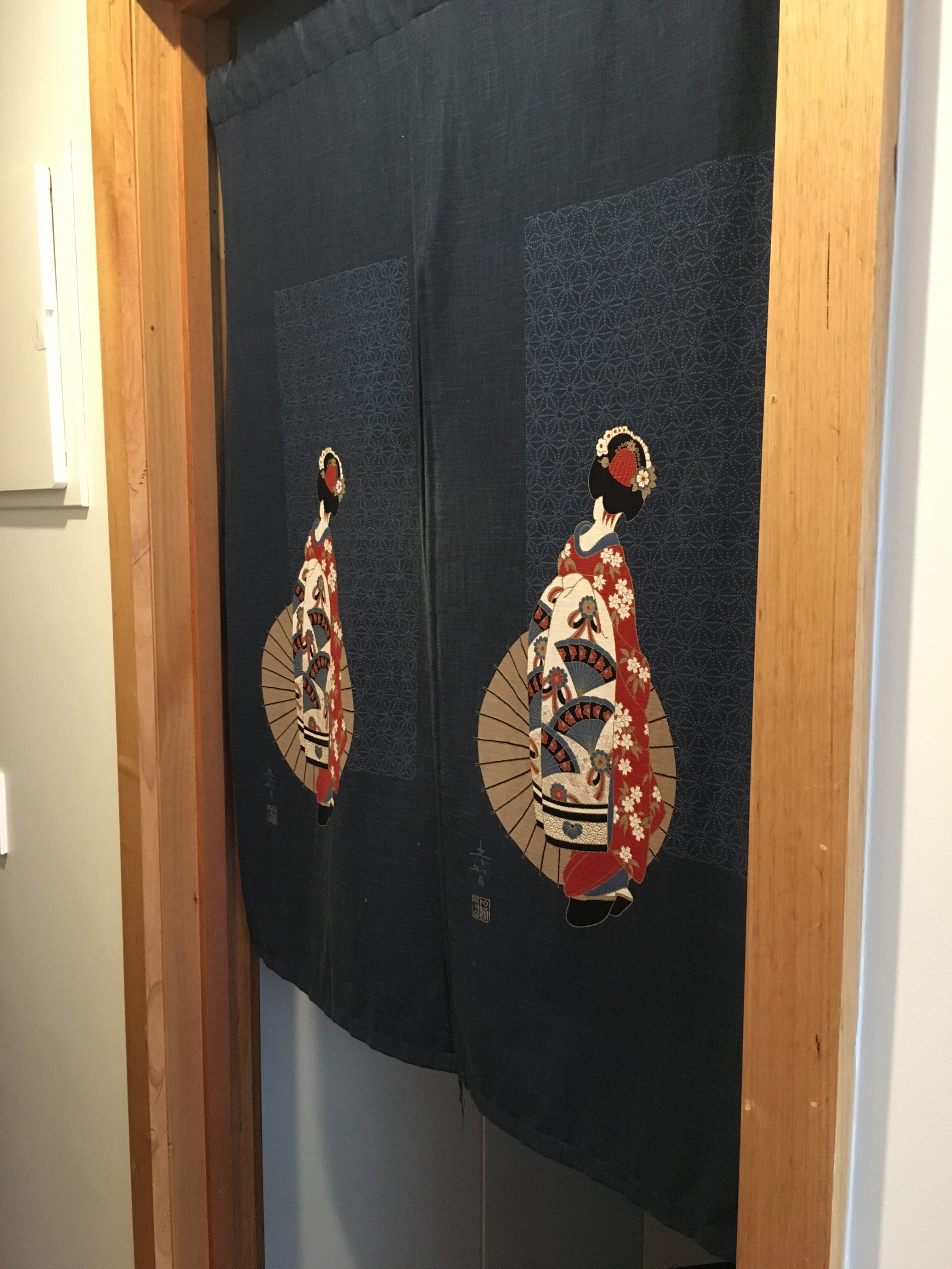 In its place a set of noren curtains. The curtains are made out of pre-bought panels from kimono house and then sewn together by me .