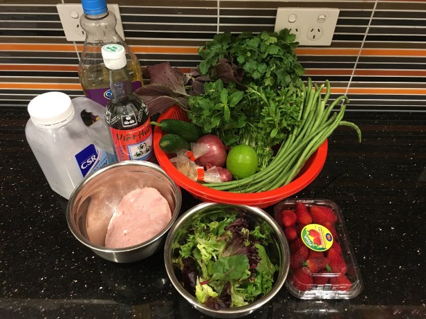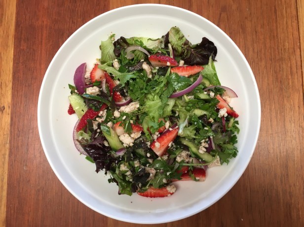 Chop all herbs , slice the Spanish onion , chilli and cucumber, quarter the strawberries and assemble it.