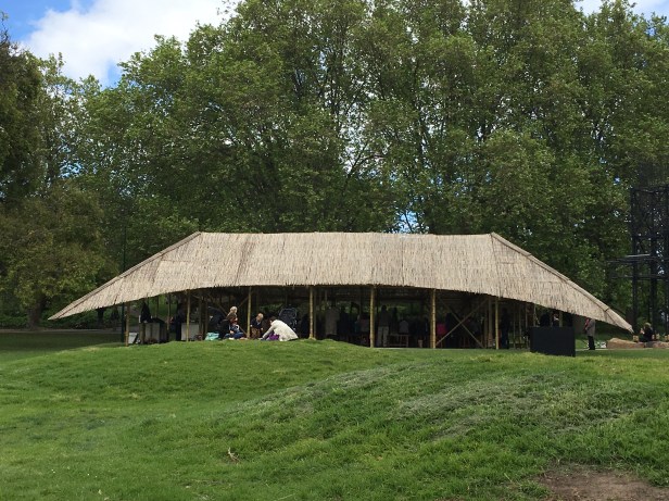 This pavilion had music playing the day I was there. People were sitting on the grass listening .