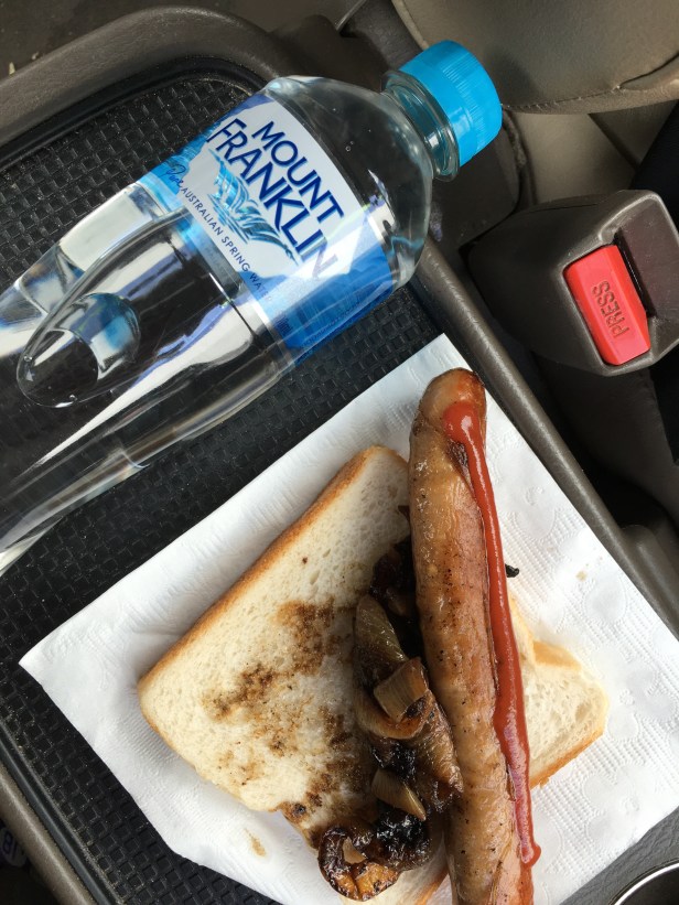 First stop the hardware store for a sausage . It’s the Aussie thing to do on the weekend. Wander through and grab one on the way out. For $2.50 it’s a cheap lunch. Water bottle is my own . I always have one with me in my back pack.