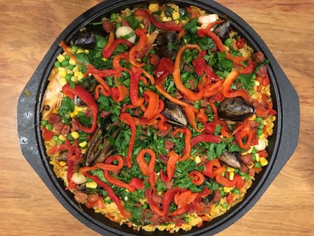 Once seafood is nearly cooked add the peas, chorizo, parsley and garnish with the shredded capsicum.