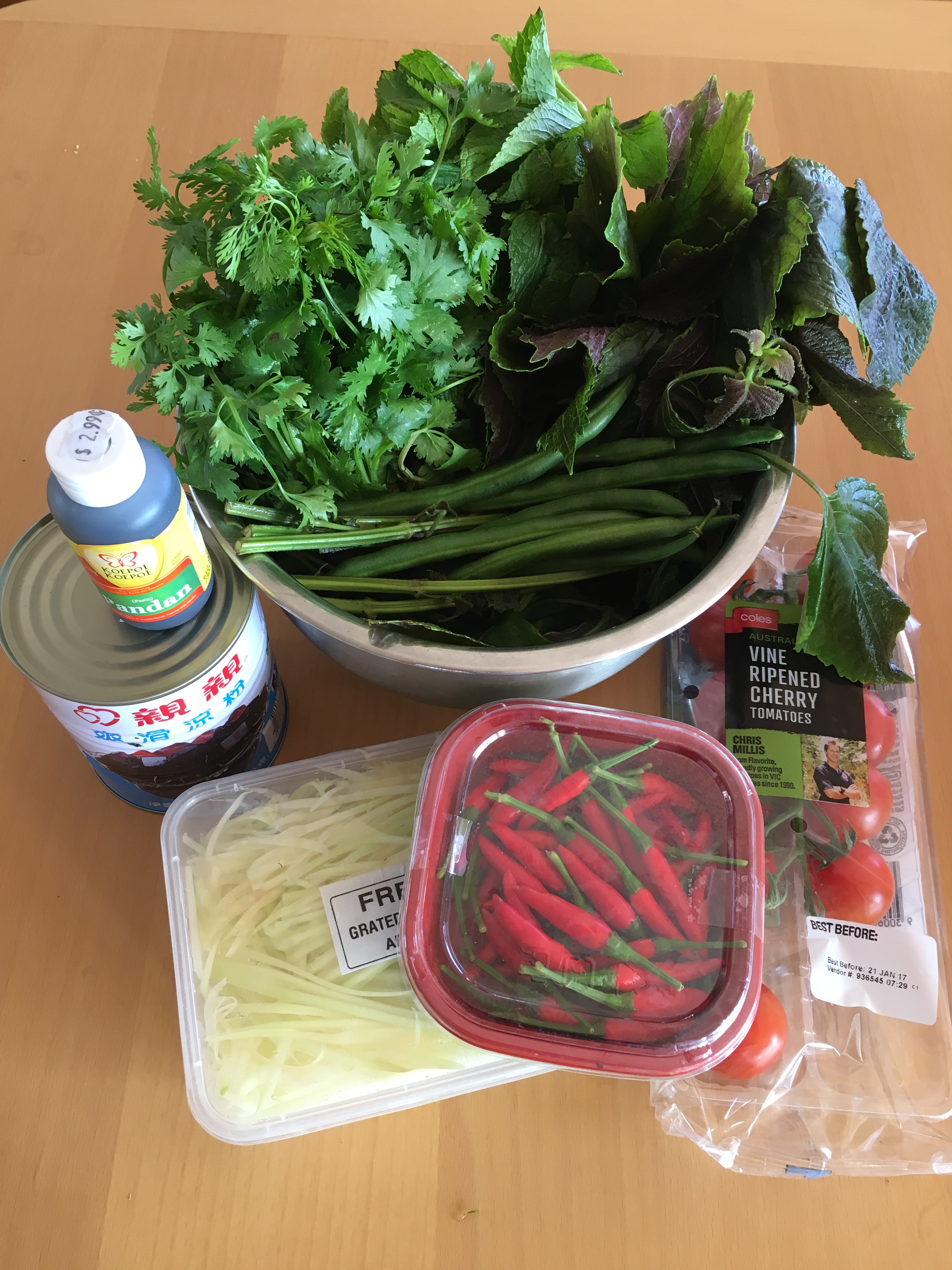 My purchase from the Asian groceries place and Coles supermarket (beans and tomatoes )