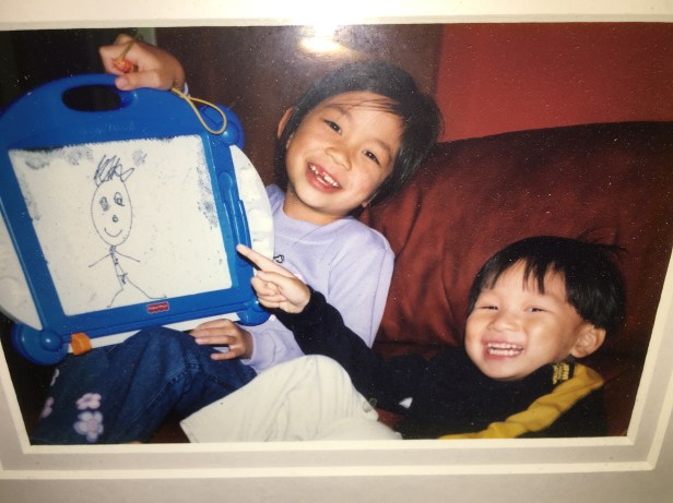 Photo of him sharing a laugh with his sister. He thought the drawing was hilarious.