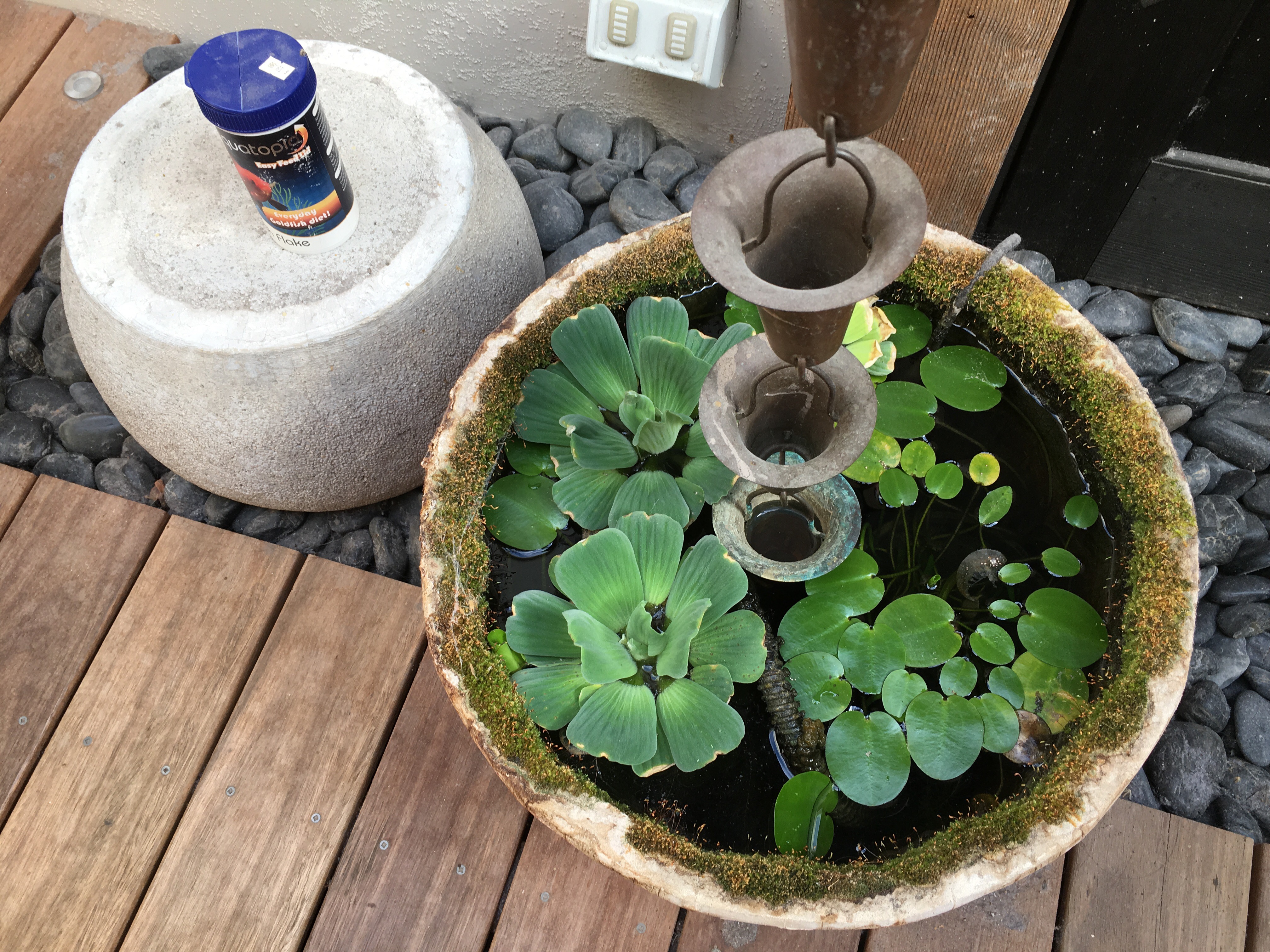 Might have to get hubby to take the pump out. Originally it’s to pump the water back up so it can come down the rain chain . But it splashes too much so we just left it turned off.