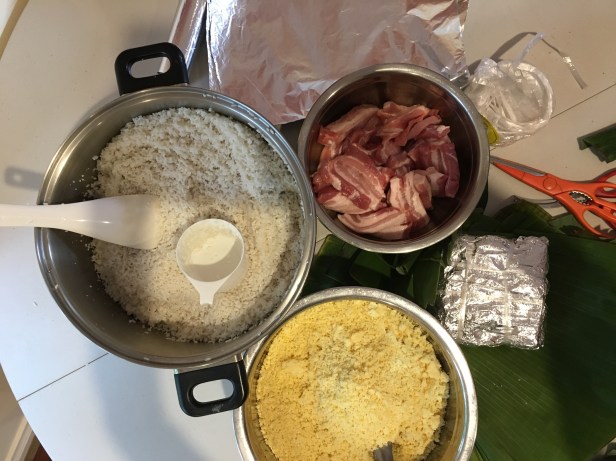 Soaked glutinous rice , processed mung beans that’s been soaked and steamed and belly pork marinated in salt and pepper.