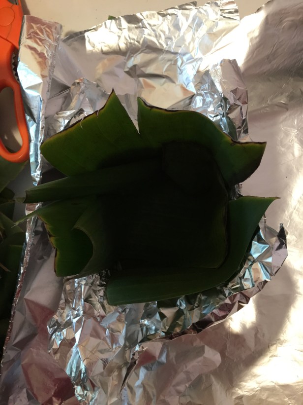 The banana leaves are used sparingly to give the cakes the green colouring. Otherwise the foil is there to hold it all together .