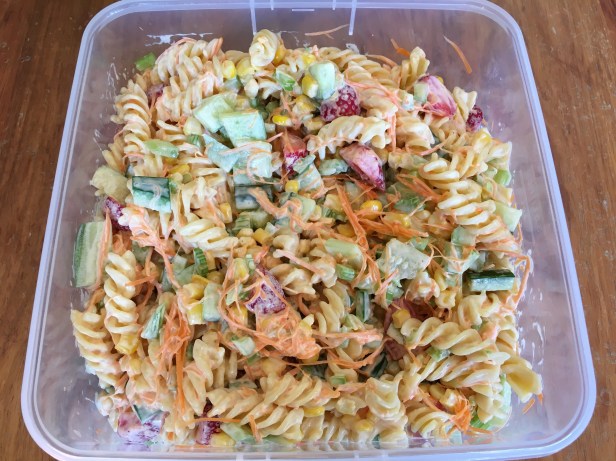 I love pasta salad . I tend to add everything and anything . There’s celery , corn, cucumber, strawberries and carrot in this one .