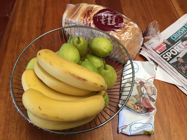 All ready for school , bread, fruits, ham and salami for school lunches.