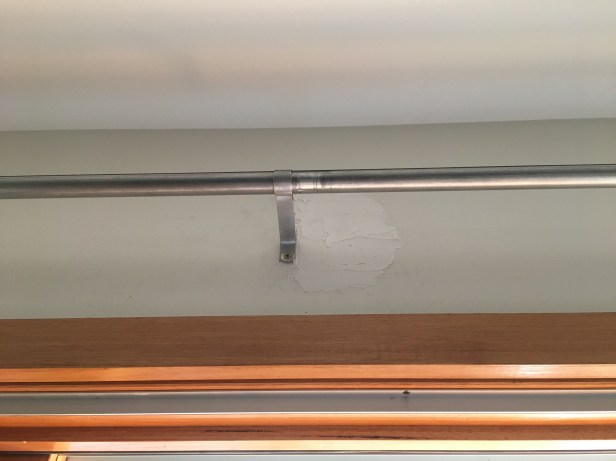 Our bedroom, will eventually swap the drapes for roman blinds. And if I hang the blinds from the ceiling no one is going to notice the plaster.