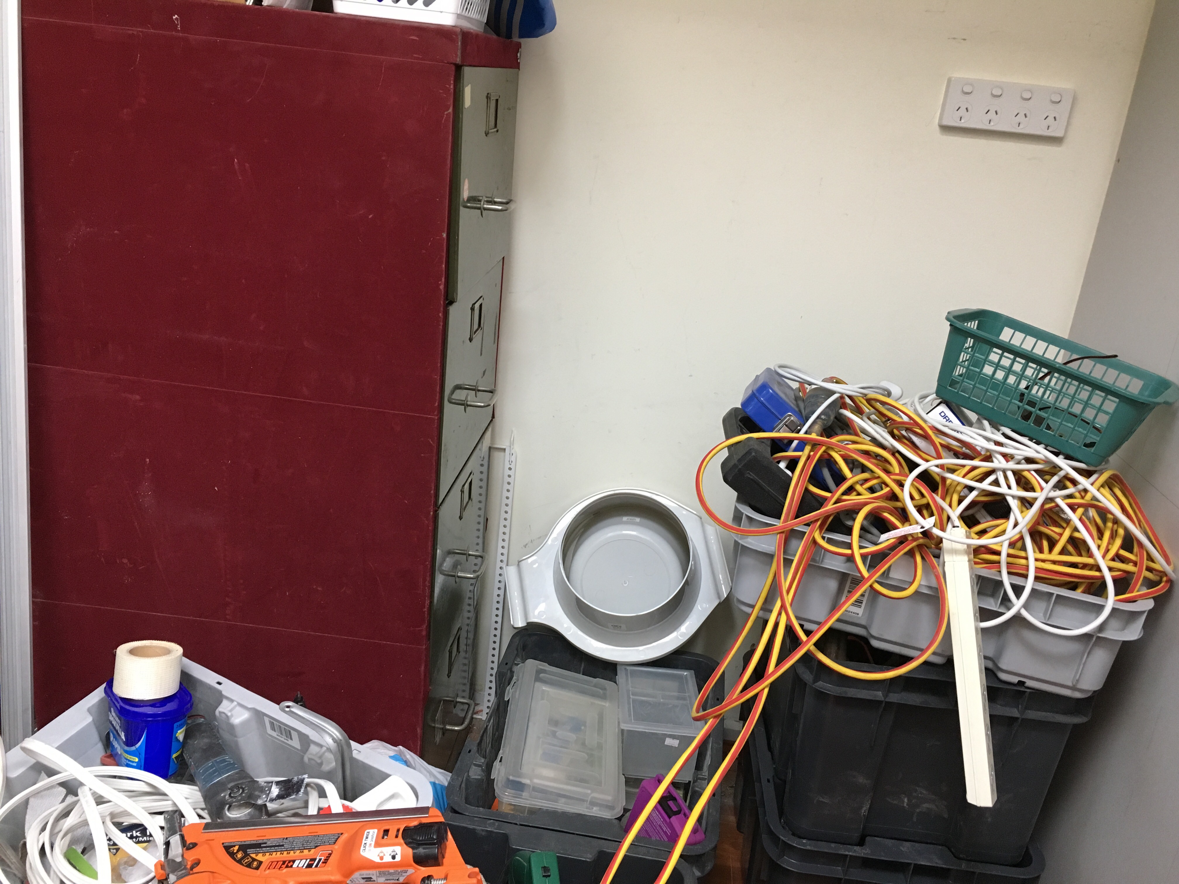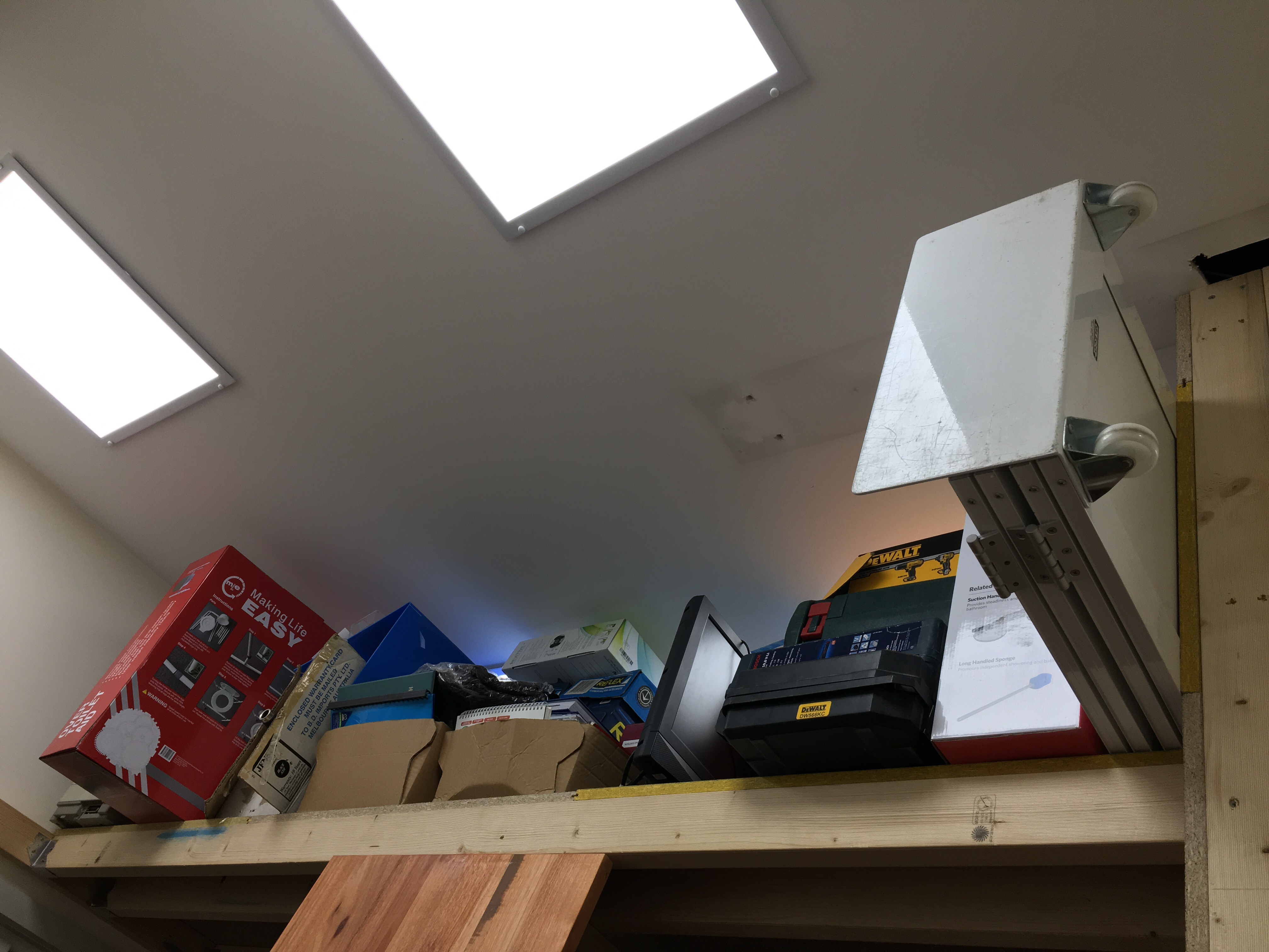The mezzanine is chockers though some can go in the bin. Can’t sort it out now since he’s got his sight on finishing the room.