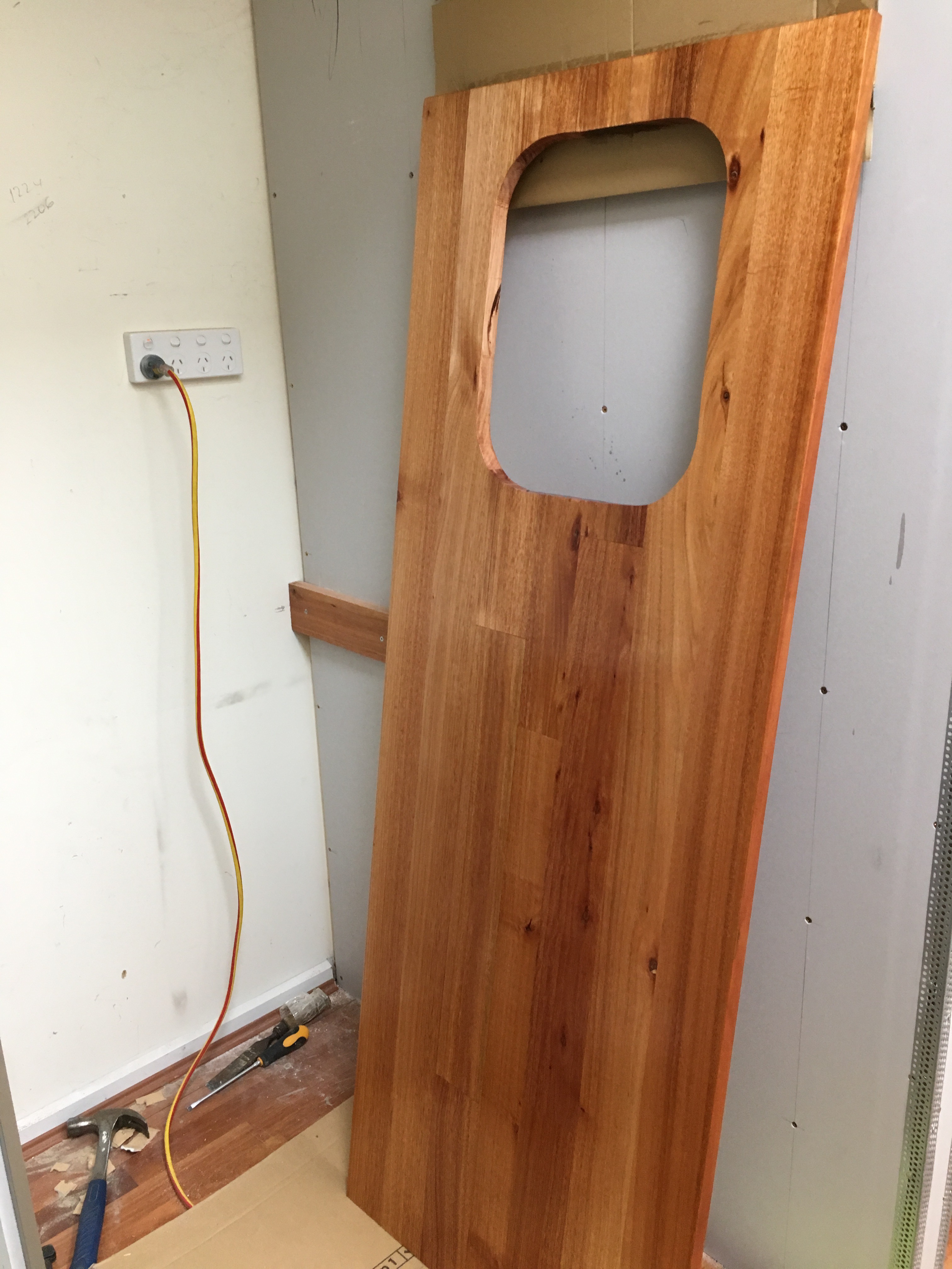 The bench top has a coat of clear sealer on it. The sink will now be an overmount as advised by the plumber .