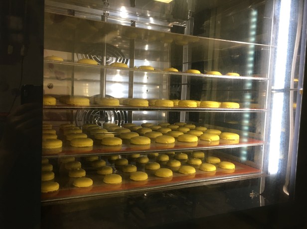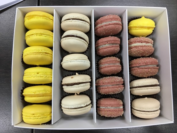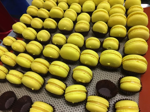 Our share of the goodies. The pink ones are raspberry jam and ganache. The white ones are coffee flavoured and the yellow, passionfruit.
