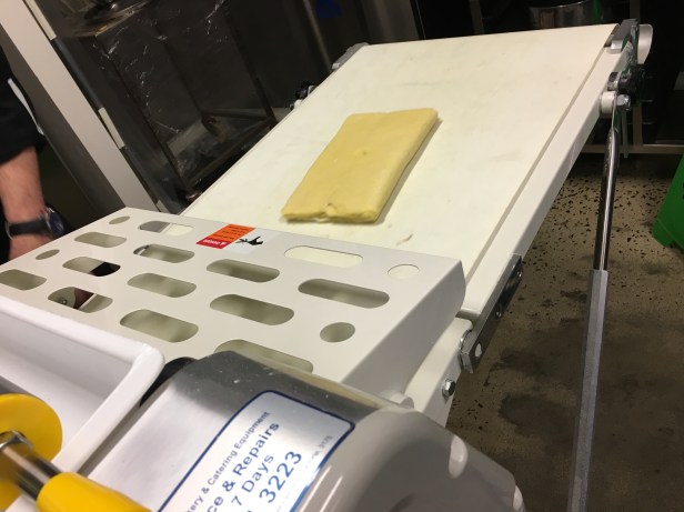 I had a go on the machine and well our kid of a puff pastry ended up on the floor so that was that .