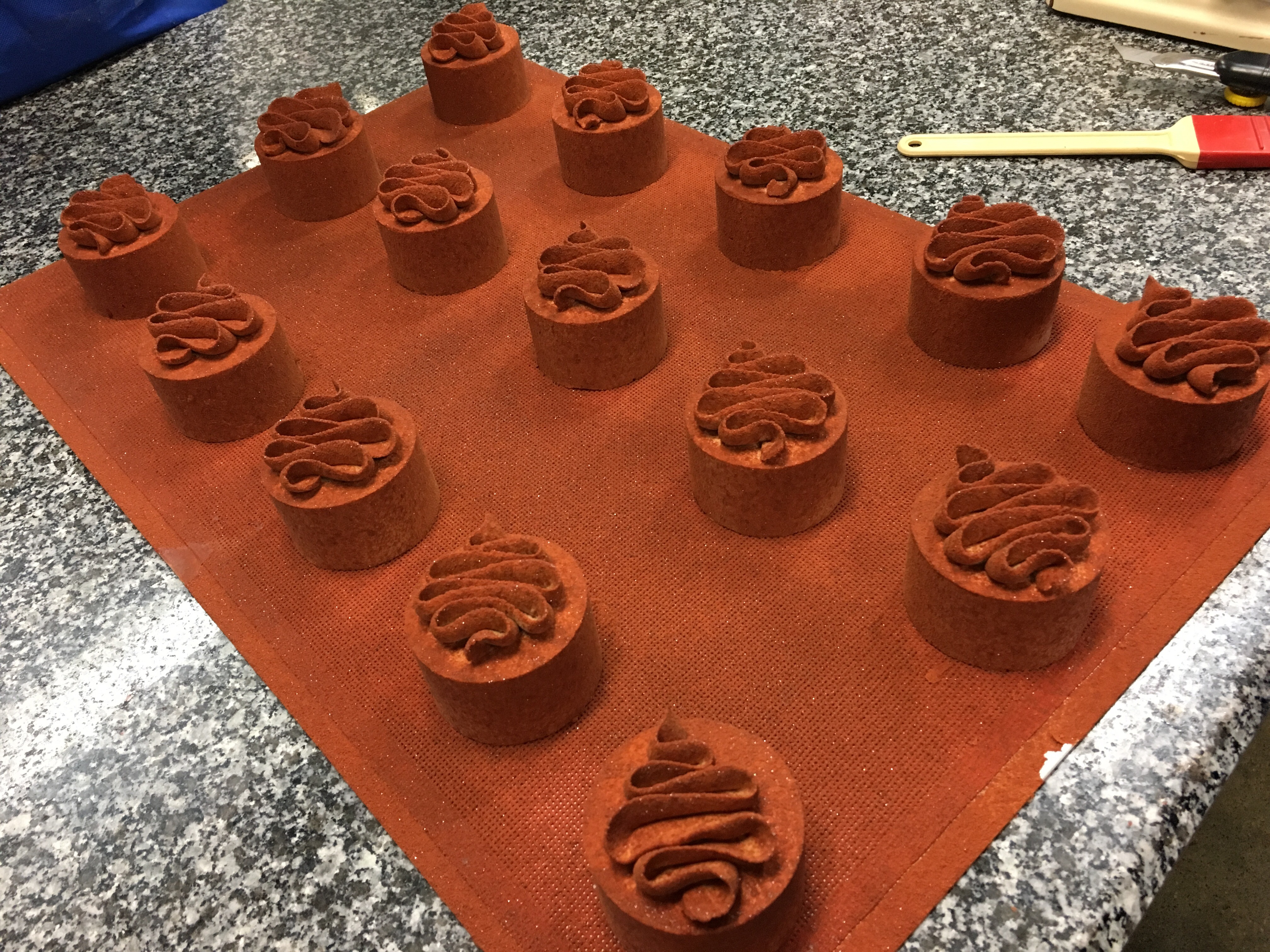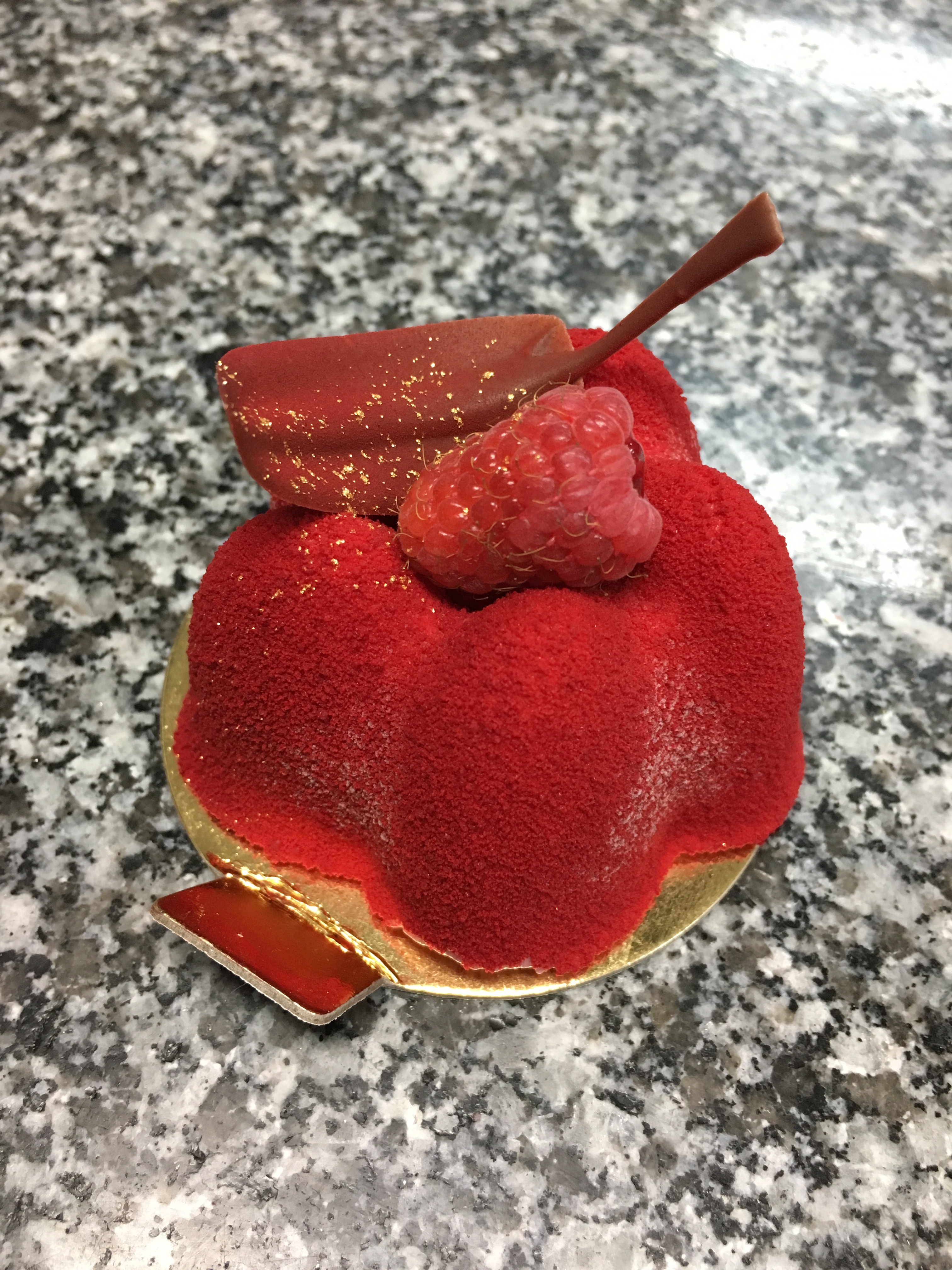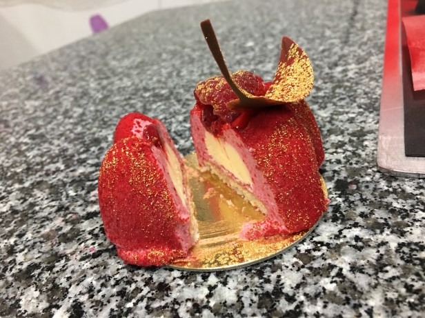 Lots of layers went into this one. We made a sponge then the raspberry mousse and a mint infused insert that was frozen overnight.