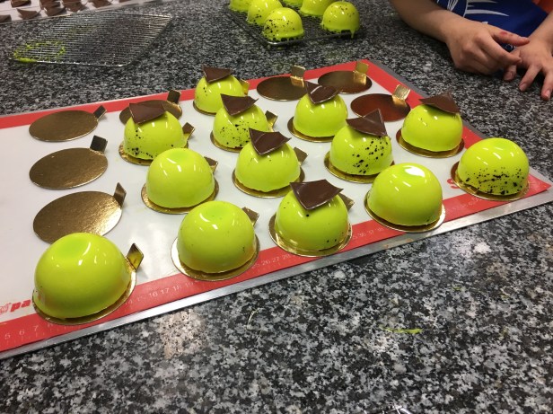 This one also had three layers white chocolate mousse with lime and pineapple insert and a lime sponge with a green glaze speckled and then a chocolate garnish on to.