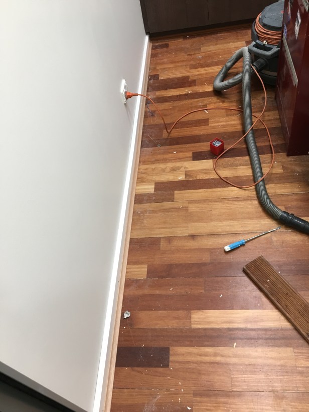 He’s pretty much nearly finished the vaccination room. Last night he didn’t have enough trim to go around the room. The piece he bought he made a mistake with the cutting.