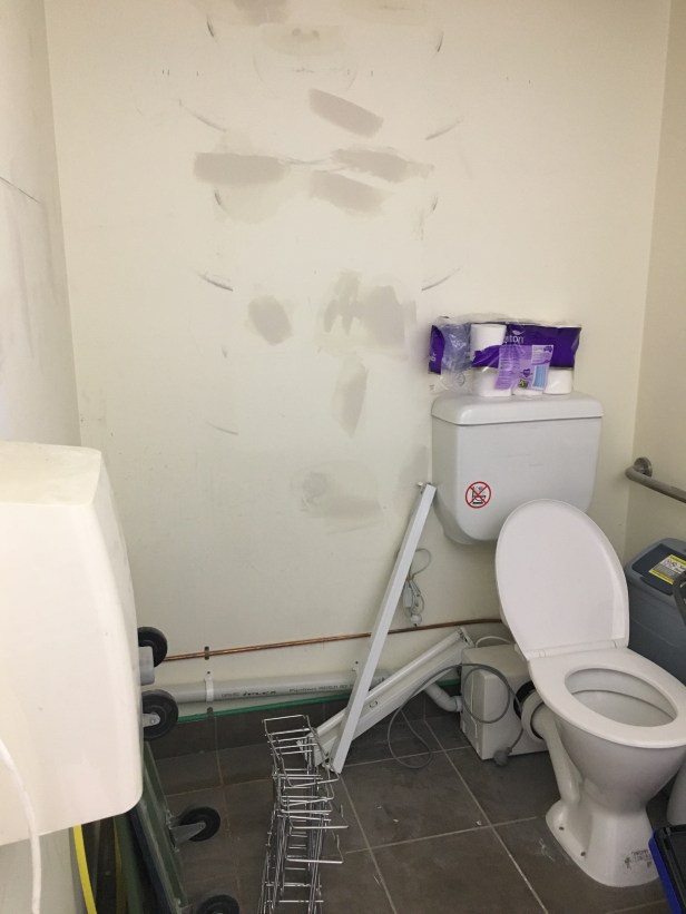 The staff toilet has been cleared 80% . This morning I’ve popped the hangers and uniforms into the lockers . It’s nearly ready to be painted only a few spots to be patched up. Then the lockers can be placed in its permanent home next to the hand dryer.