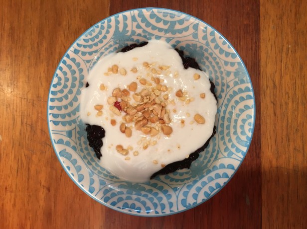 The most simple dessert ever . I panfried the sesame seeds and peanuts before I left for lunch.