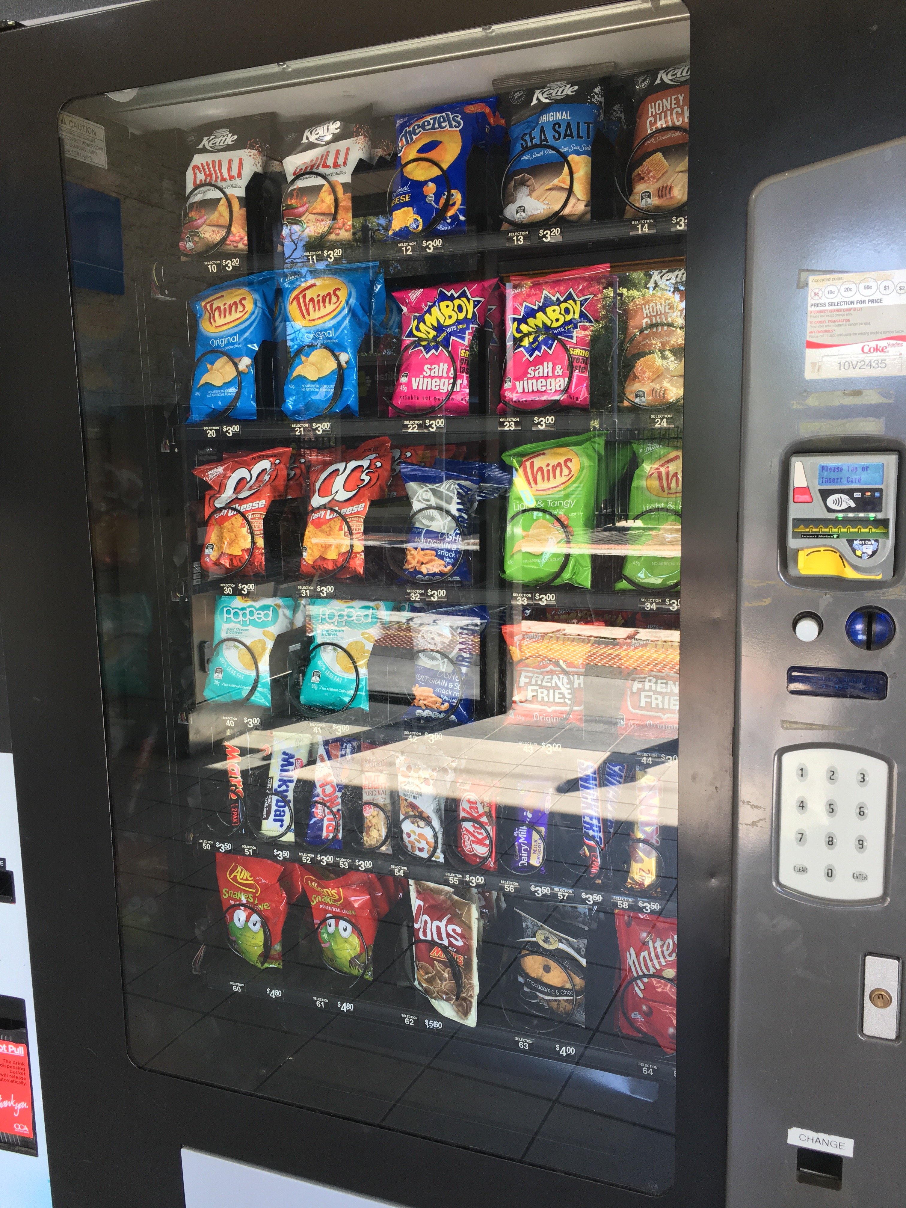 The snack machine looks good . Can see adult (Kettle) flavoured chips. Salt and vinegar is always popular as are the Maltesers. And yummo snakes lollies.
