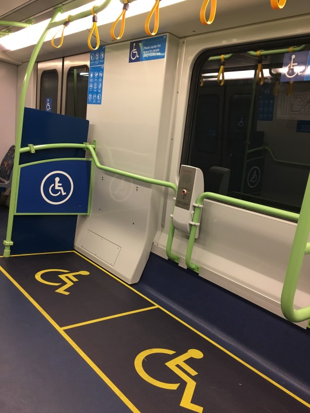 I must have caught one of the newer trains back. First time I see this. The older trains have seats that’s then folded up to allow wheel chair access. Now it’s a designated wheel chair space. May be they only have it in certain carriages ? Like the first or last carriage ? As I saw 4 spaces two on either side.