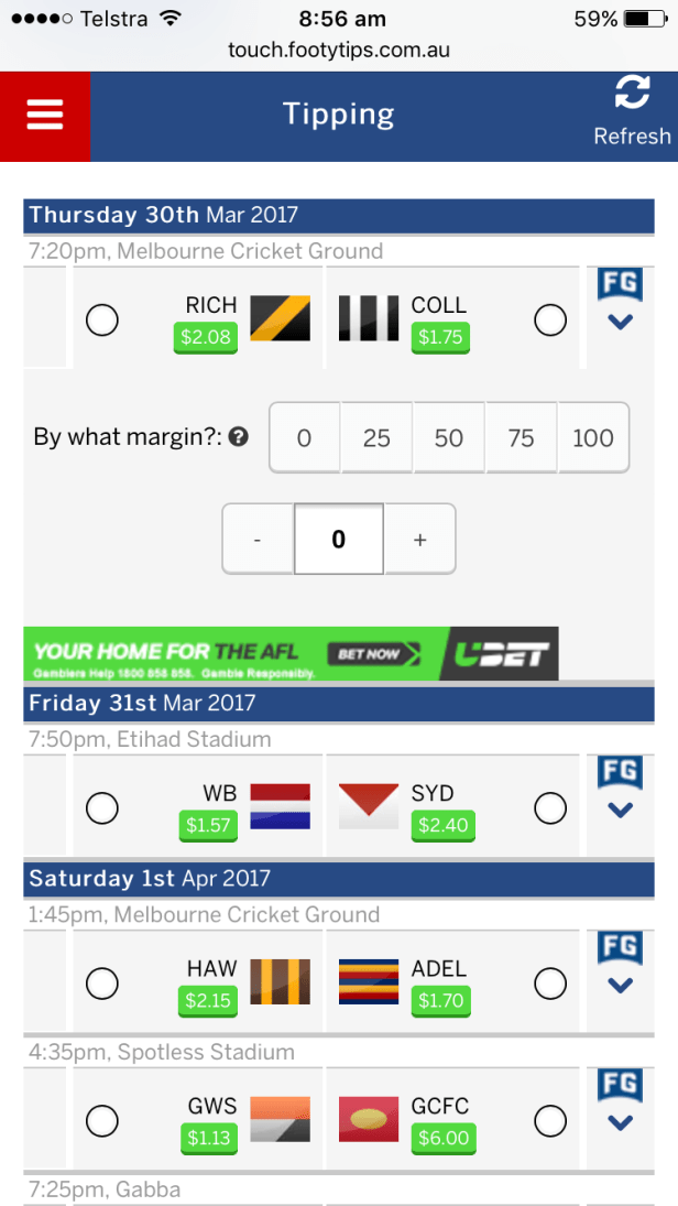 Usually our footy tips are due in by Thursday. This is how we play on the app.