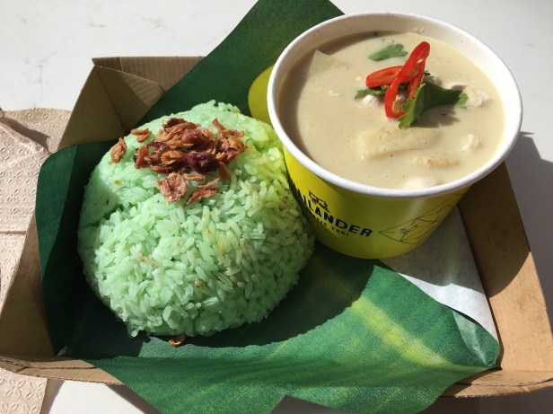 Lunch, green curry and coconut rice that looked green yet did not taste coconutty at all. The curry tasted okie for food court standard.
