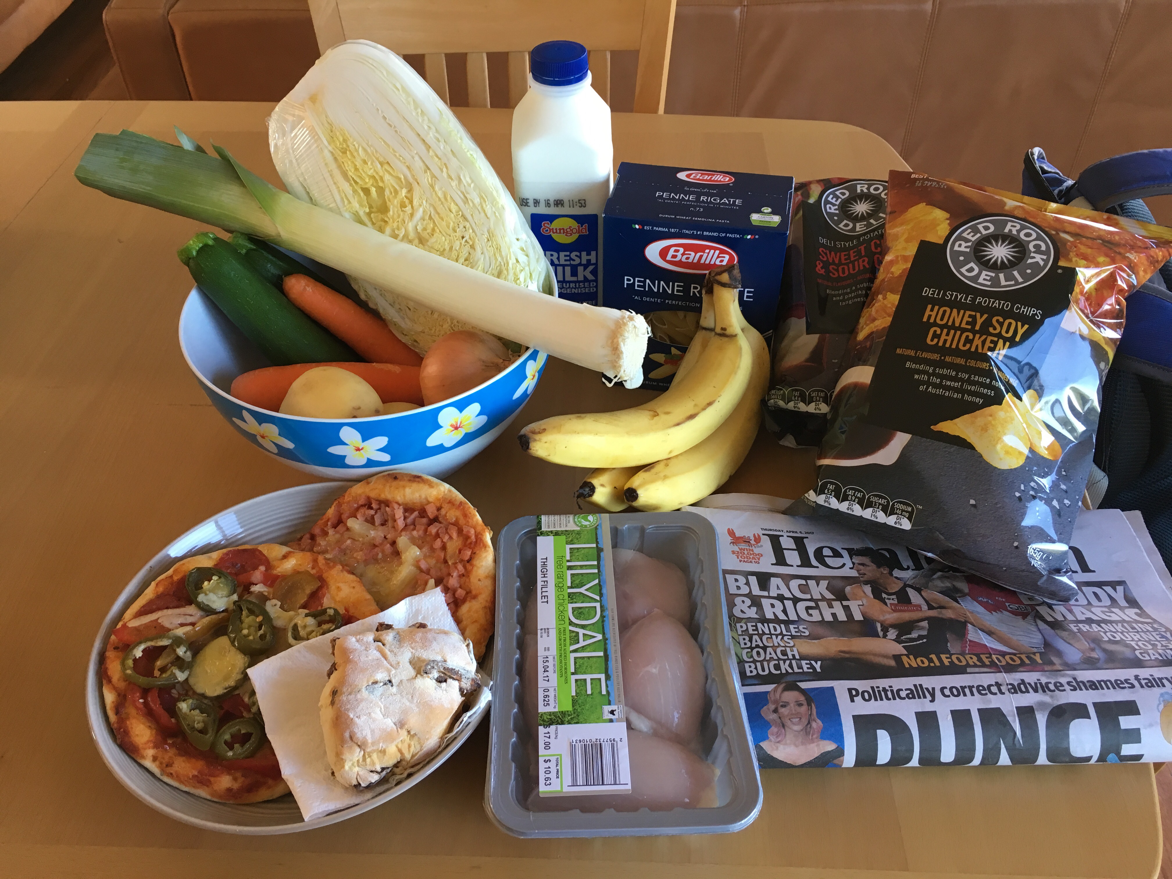 Groceries on the way back . Pizzas and scone for breakfast tomorrow . As brunch costed near $70 for the 3 of us today.