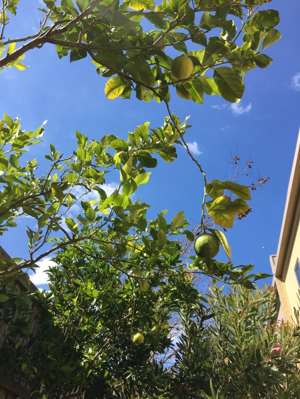 Our lemon tree giving us fruit this year. Covering the ground with bark must have helped. The lemons are bigger and more plentiful.