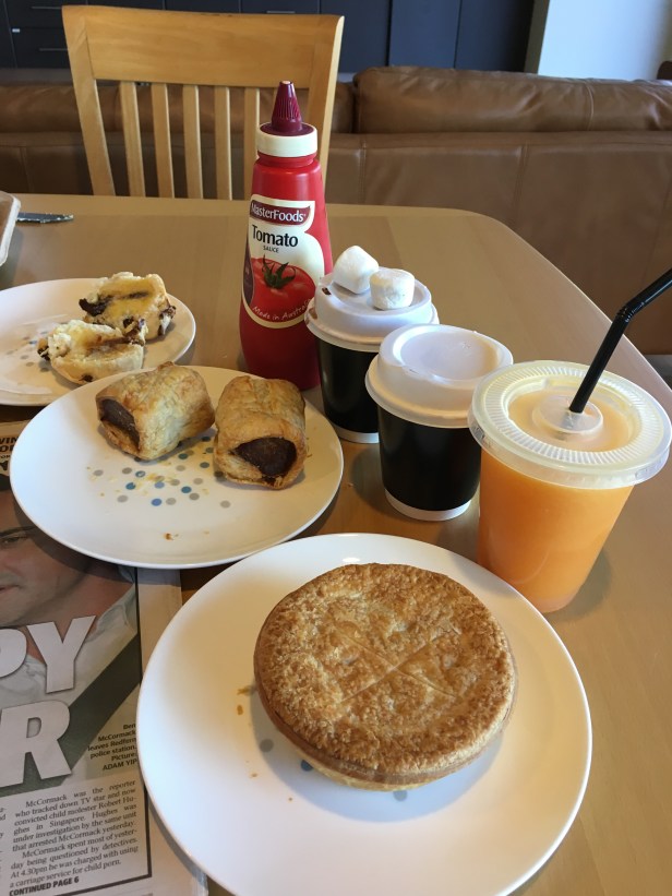 Have gone to grab coffee, hot chocolate, juice . A pie for me and sausage rolls for the kids to go with their scone and pizza.