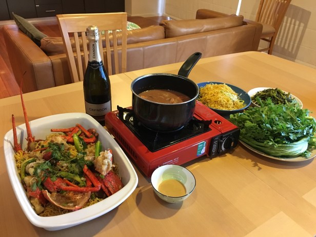 Stir fried lobster noodles, goat steam boat and stir fried water spinach . The sauce is actually tofu cheese for the steam boat.