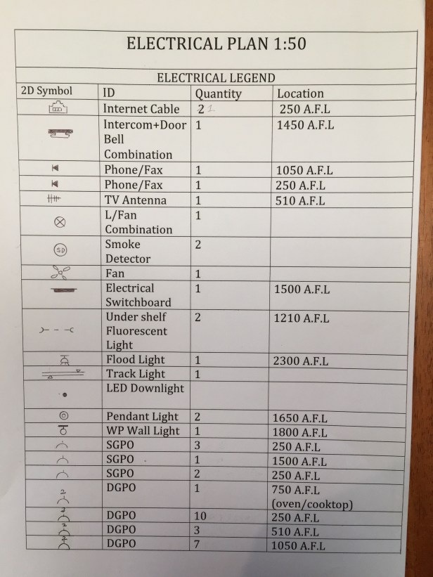 That way everything is covered . I tend to go through the house or apartment and note down how many lights and power points I’d need. Whether I’d need a double or a single and the position of the points.
