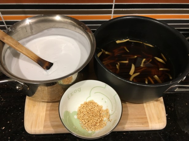 Into the syrup they go and then the milk and sesame seeds on top.