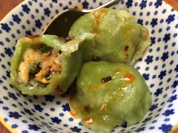 These are the vegetarian ones. They are filled with cabbage, vermicelli , tofu, egg and garlic chives. I’ve drizzled them with ponzu sauce.