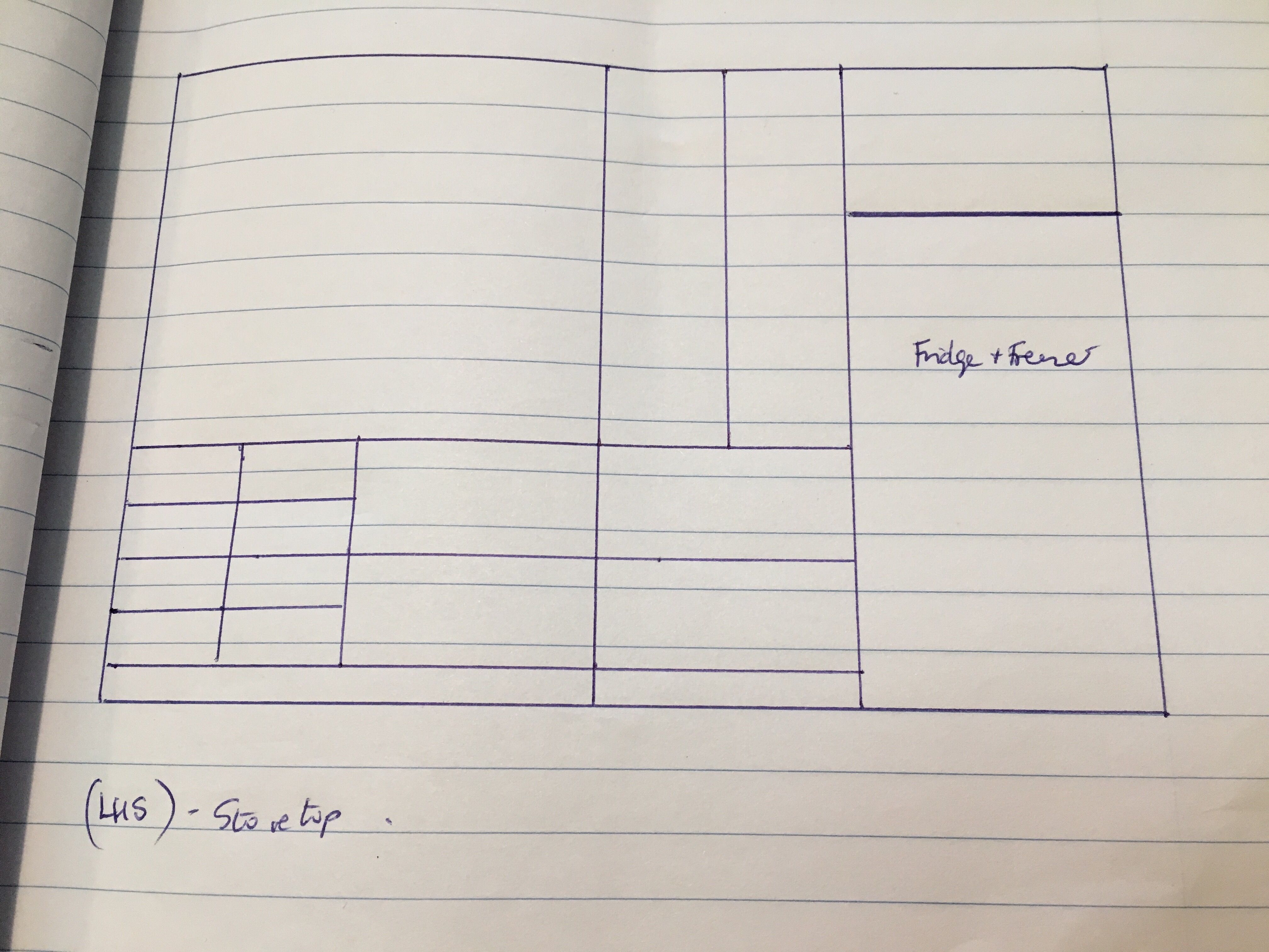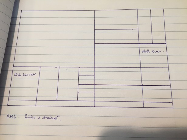 On the other side I’ll have two sets of 4 drawers underneath the stove top. Then two sets of large drawers. A big cupboard on top for crockery.