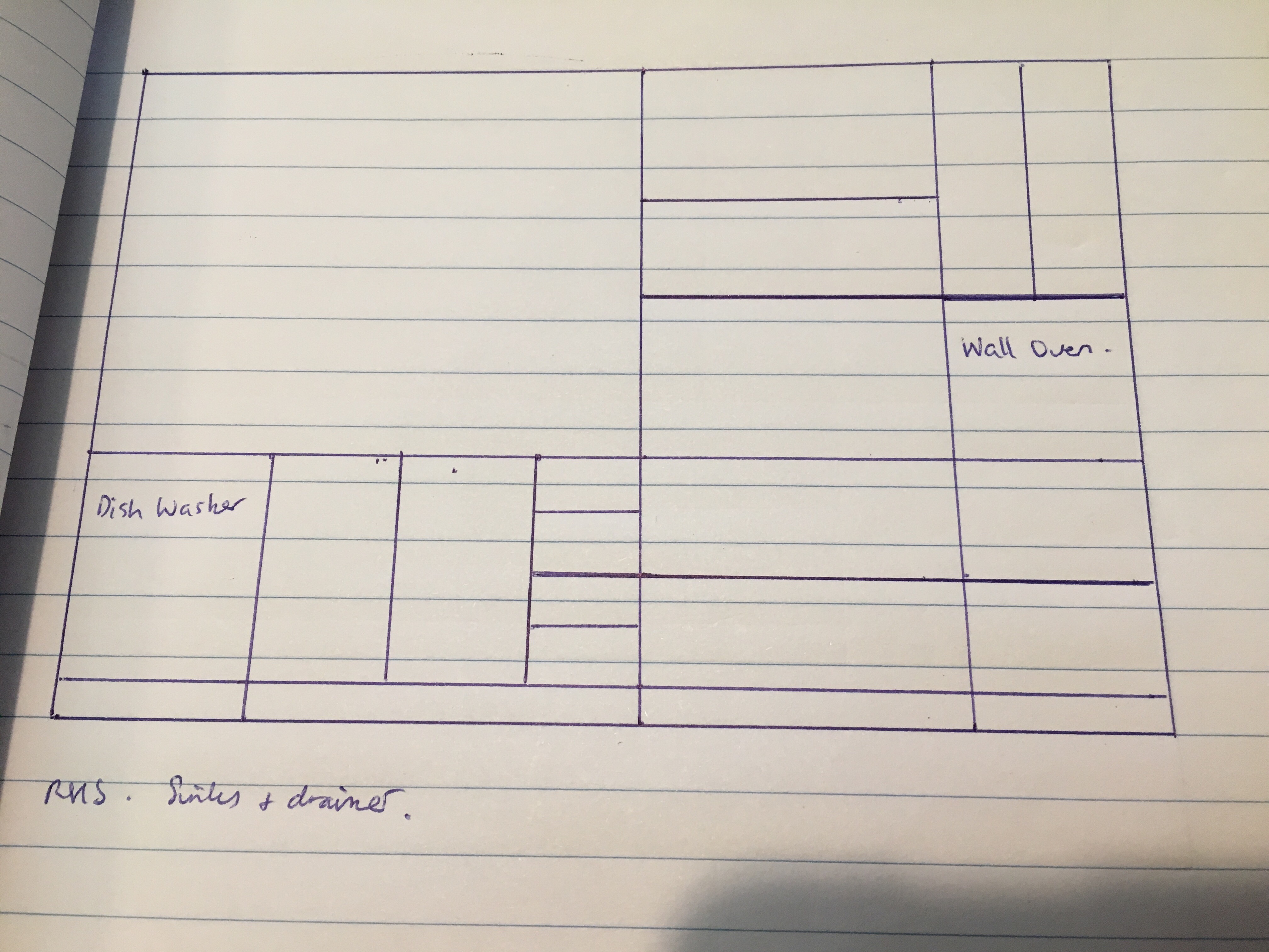 To the left will be the dishwasher . Then under the sink cupboards. Couldn’t make them any smaller than 900mm plus I need them to balance out the other set of cupboard and the big drawers . Which leaves me with about 370mm for a set of 4 drawers. Above the bench will be two open shelvings . Underneath two large drawers.
