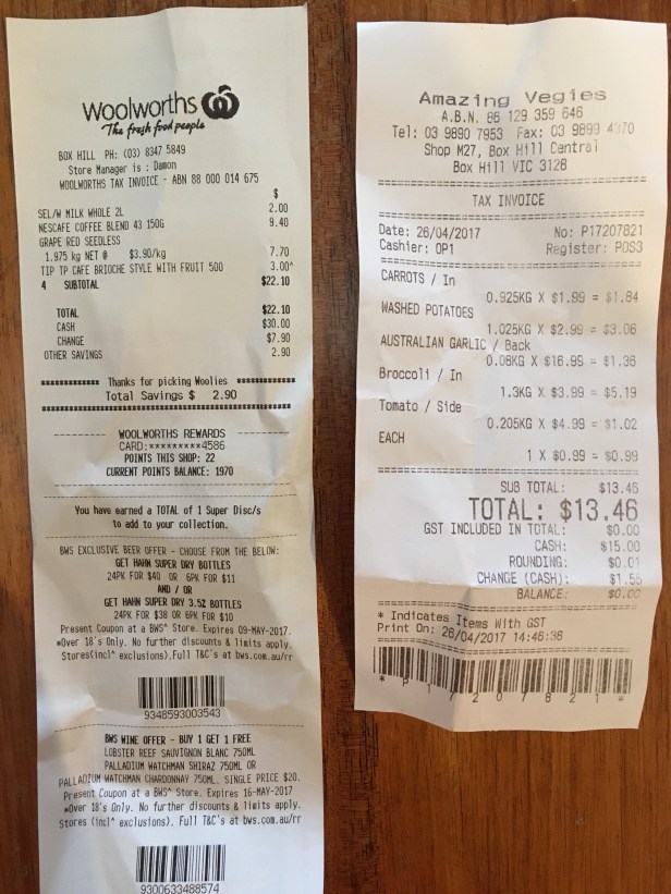 My receipts today. The chicken chops weighed 1.5kg at $10.99/kg .