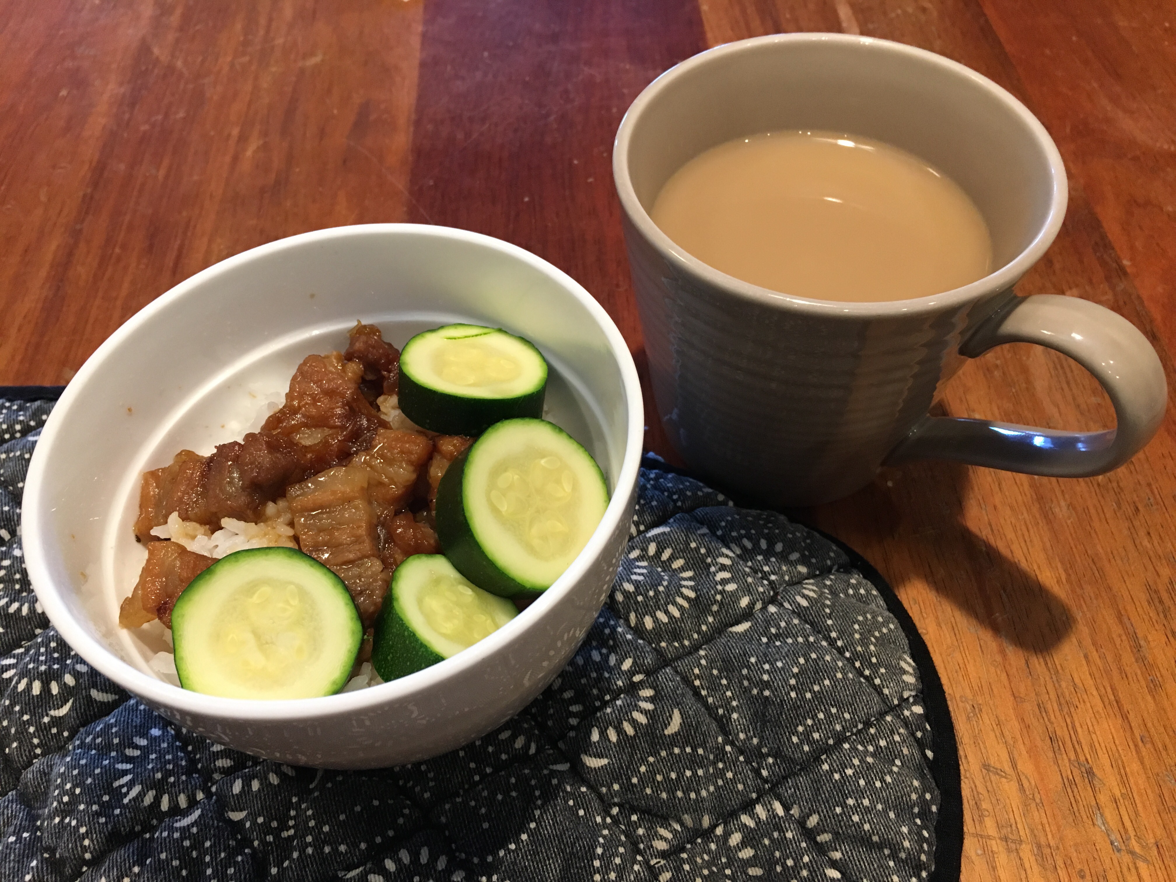 Left overs for breakfast with my coffee. I prefer rice over bread and pasta. Too much wheat makes me bloaty. I love hot breakfasts.