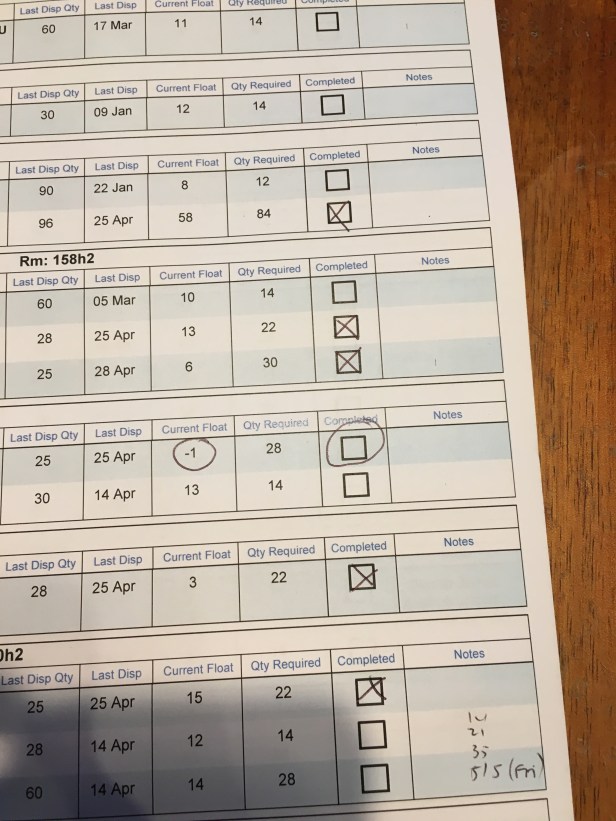 Let say the client’s float is negative it doesn’t tell me I need 28 +that -1 . And since the pack comes in 25s I can’t actually dispense 2 packs as the client would complain so I do 1 pack and I’ll have to put through another pack when that runs low.