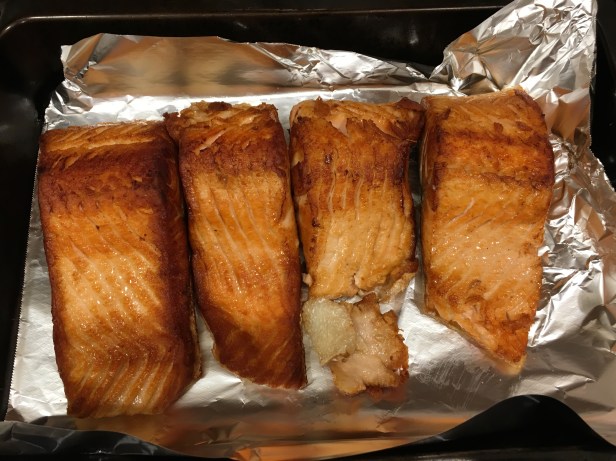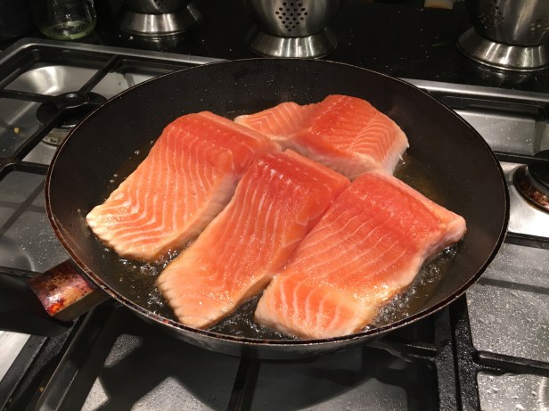 Browning my salmon then into the oven they will go for another 5-10 minutes at 180C to cook through.