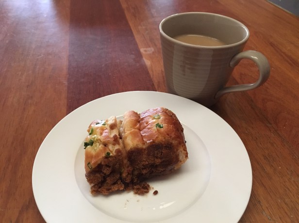 I’m munching on some bread. It’s bread baked with shallots on the outside and some mayo and pork floss.