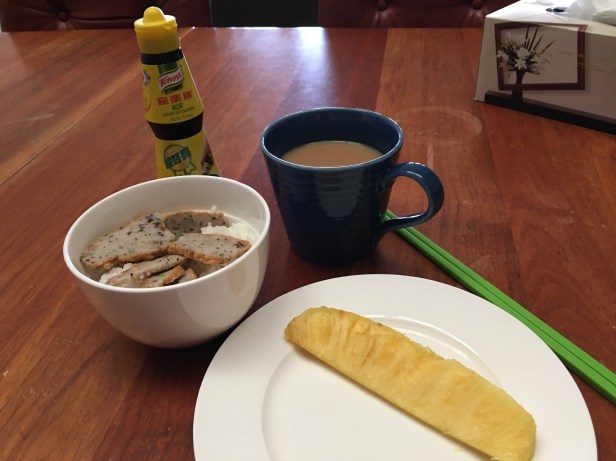 Left over rice and fish cakes from the other day. A bit salty for my liking. My instant and pineapple.