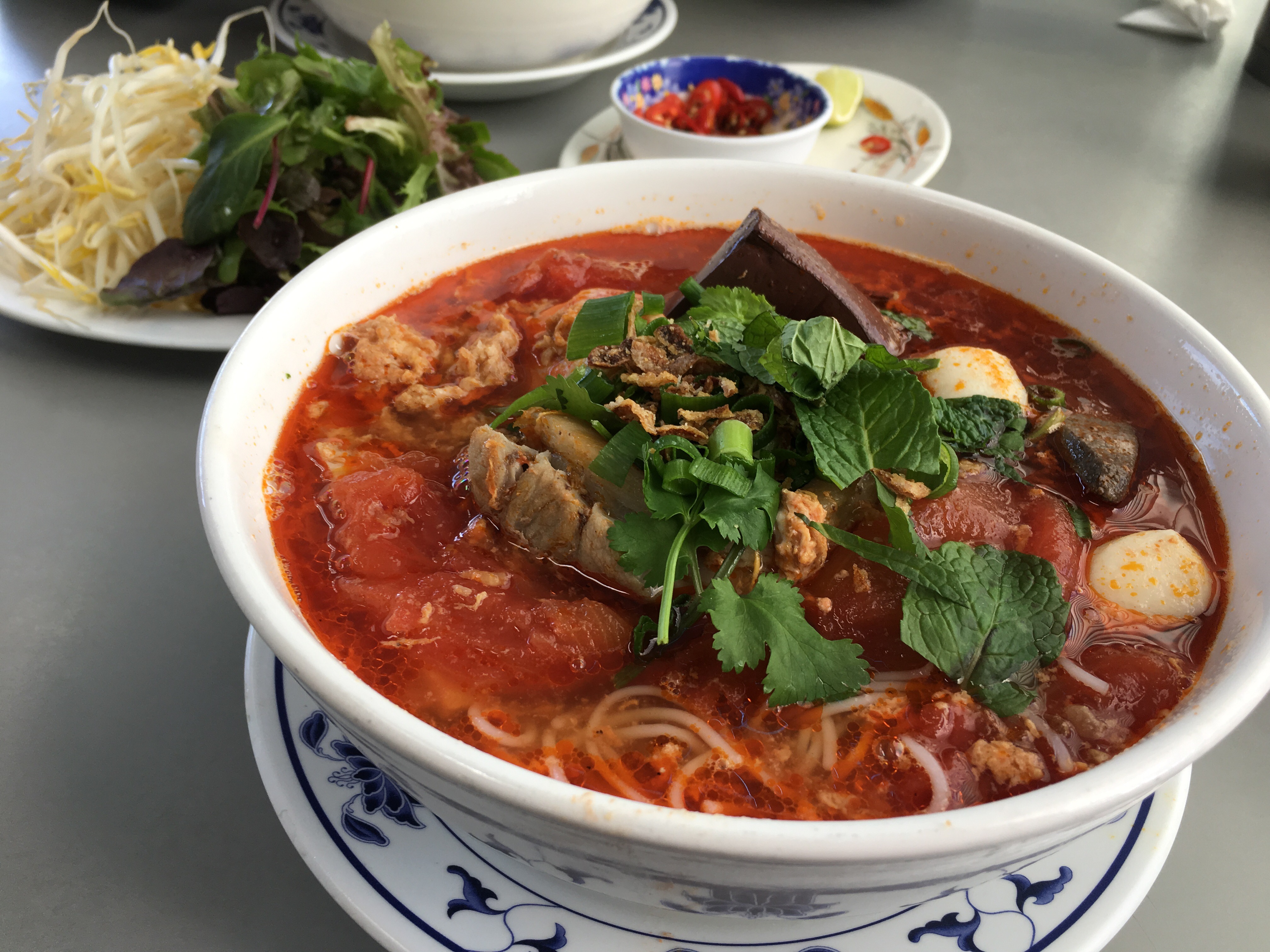 My lunch . Bun Rieu . Tasted a bit sweet and they added stuff that ummmm not supposed to be there.