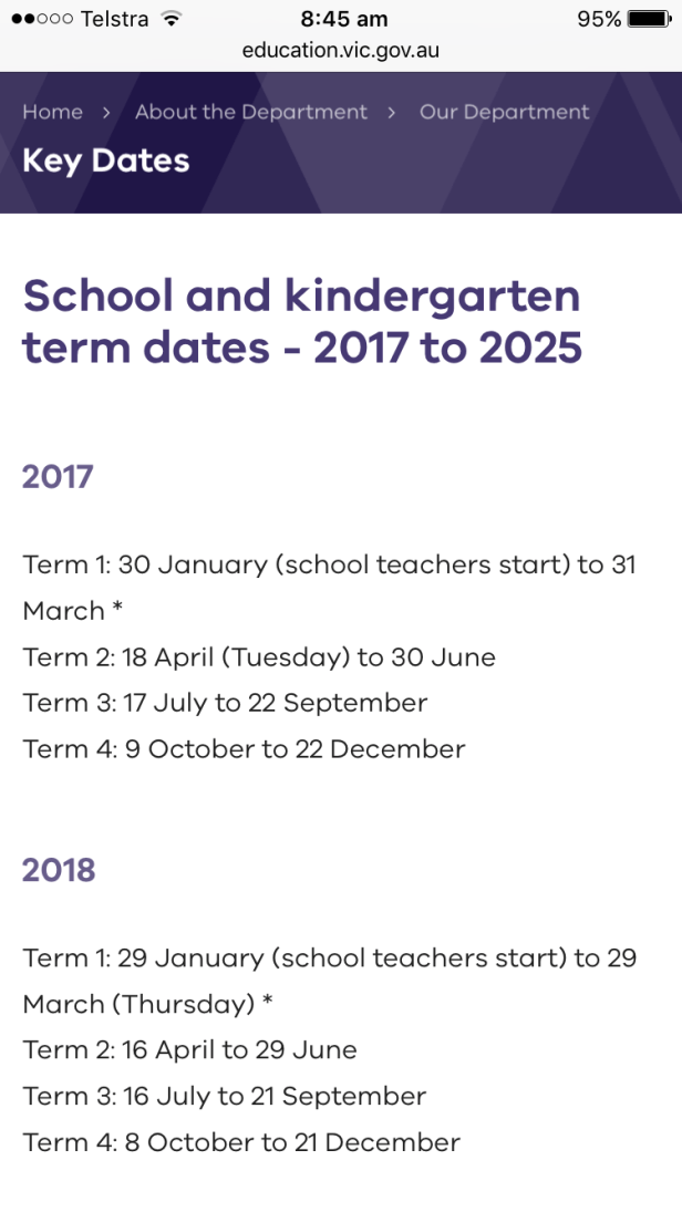 It goes like this . They start the year after Australia Day or near there and ends first term around Easter. Second term ends around June/July . Third term September/October then end of year near Christmas time.