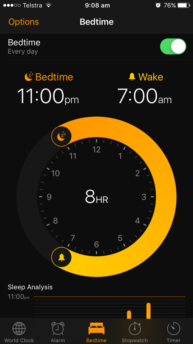 I’m trying this new thing where you can program in your sleep time and awake time. It reminds you of when to go to bed and it pipes through music to get you up in the mornings.