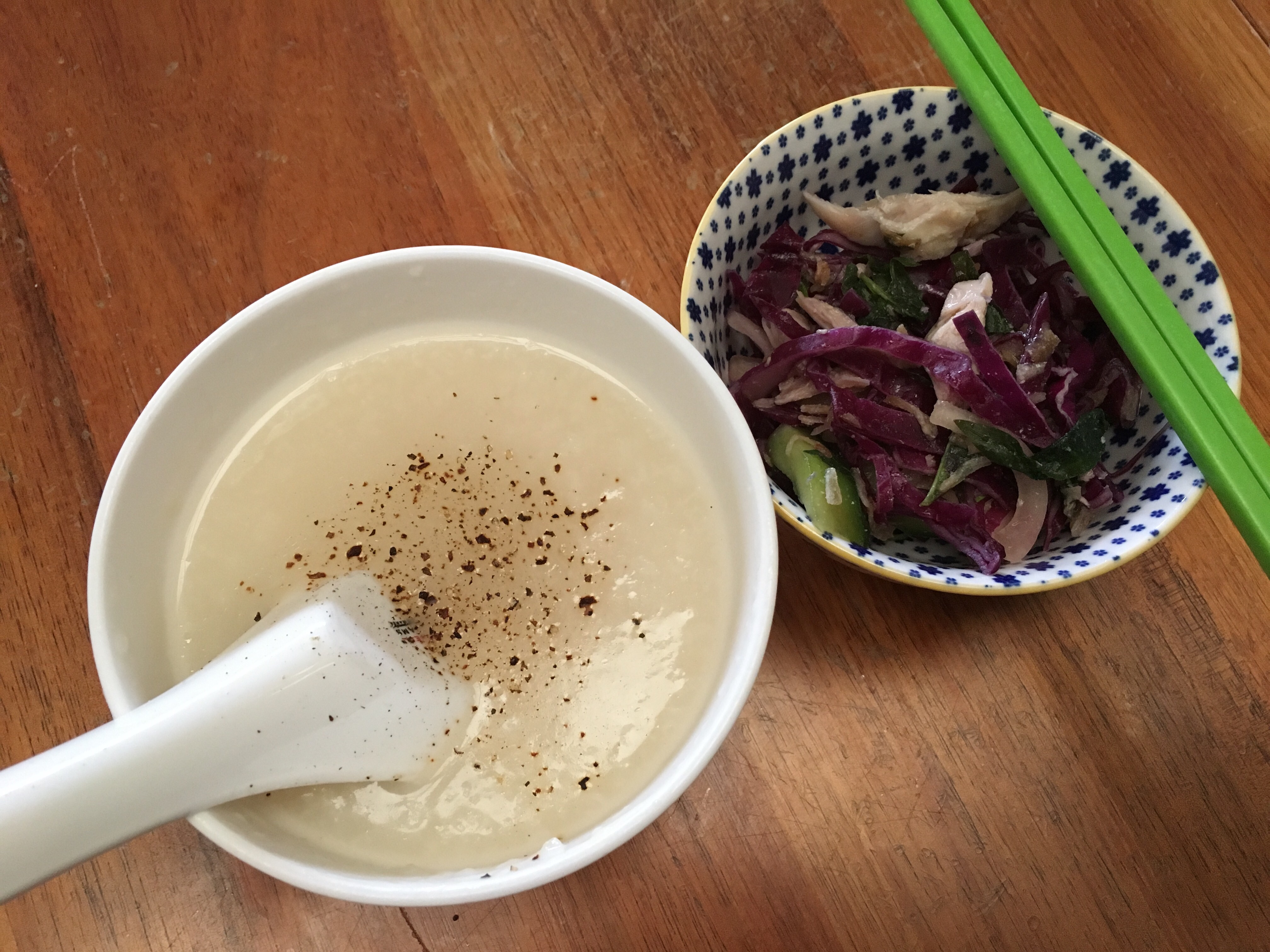 Chicken congee and salad . Food for the sick. Hubby cooked last night as I was too stuffed to cook.