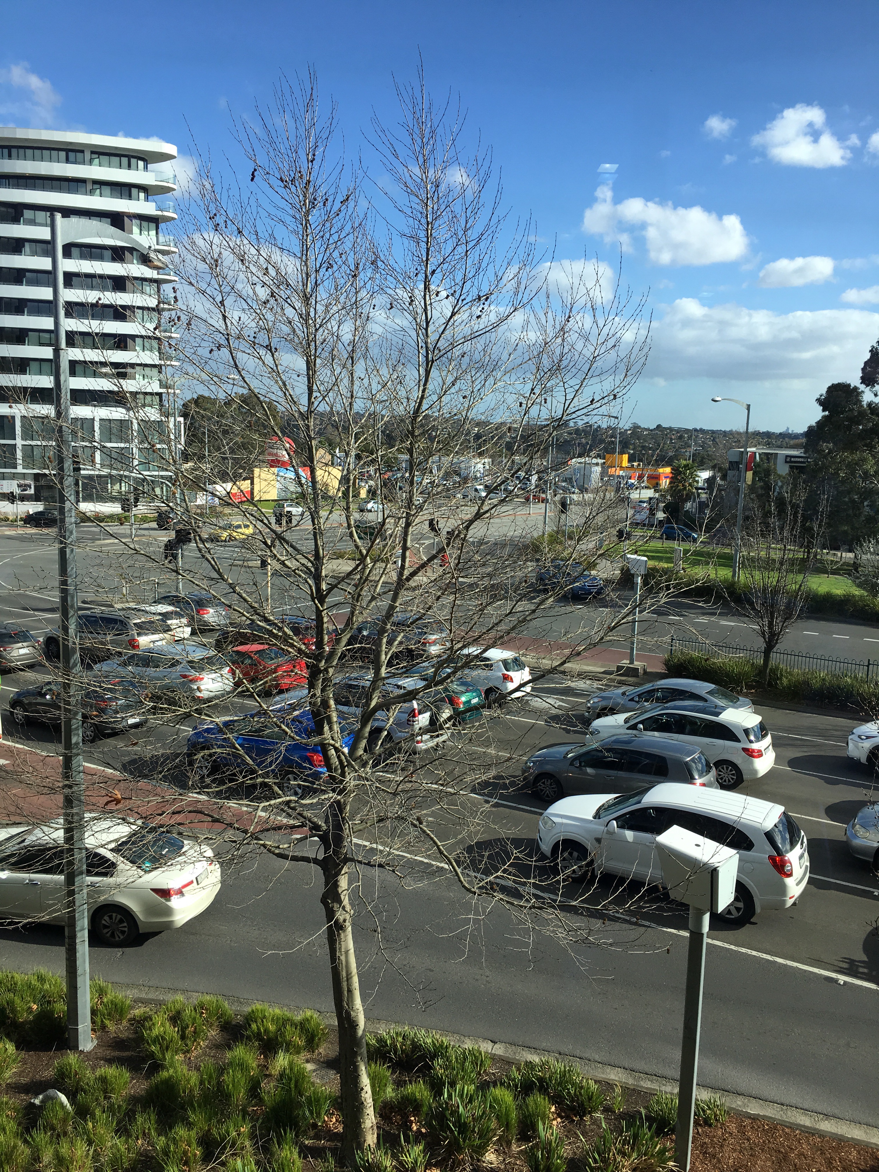 My views for lunch. The white pole is the red light camera. Our trees are still bare despite Spring just around the corner.
