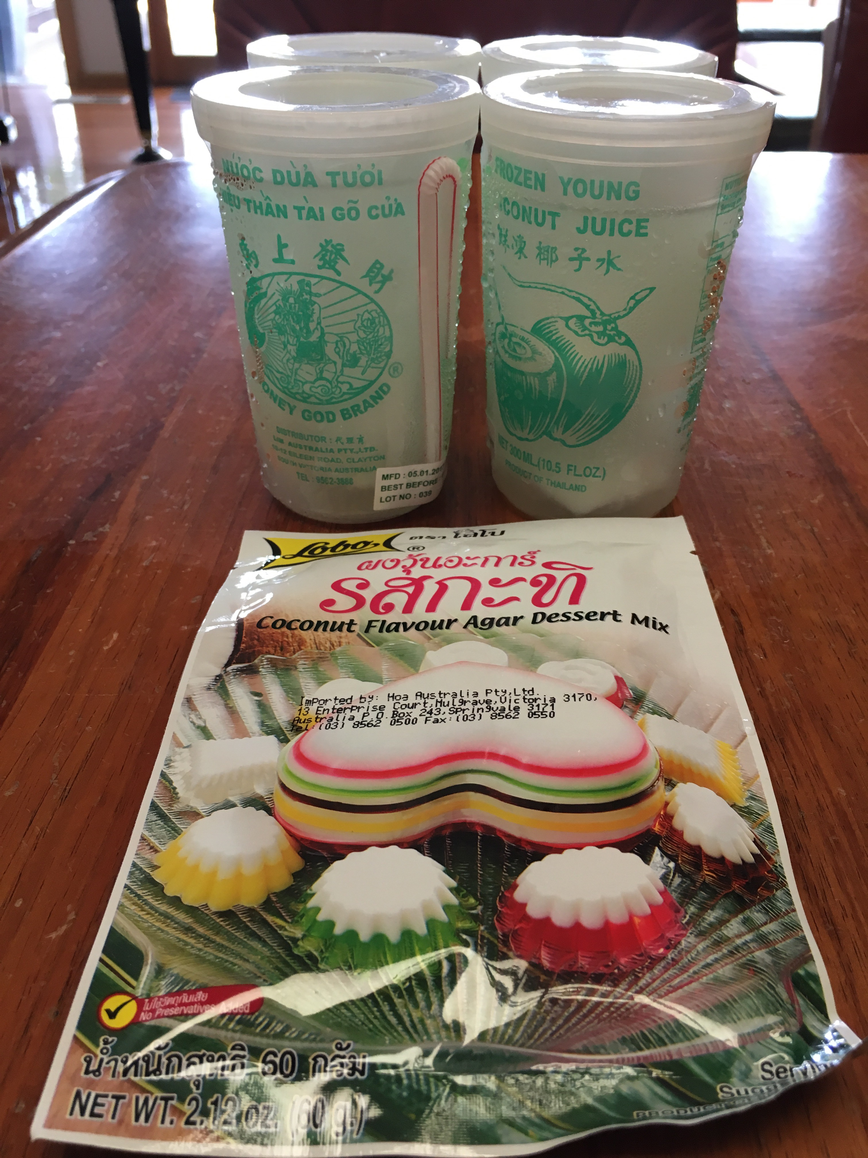 I hope I heard her right. 4 of these coconut juice and 3 cups of water to one of the coconut agar mix. Since the juice has sugar in it there’s no added sugar. The jelly needs to be light and just set not hard like the usual agar desserts.