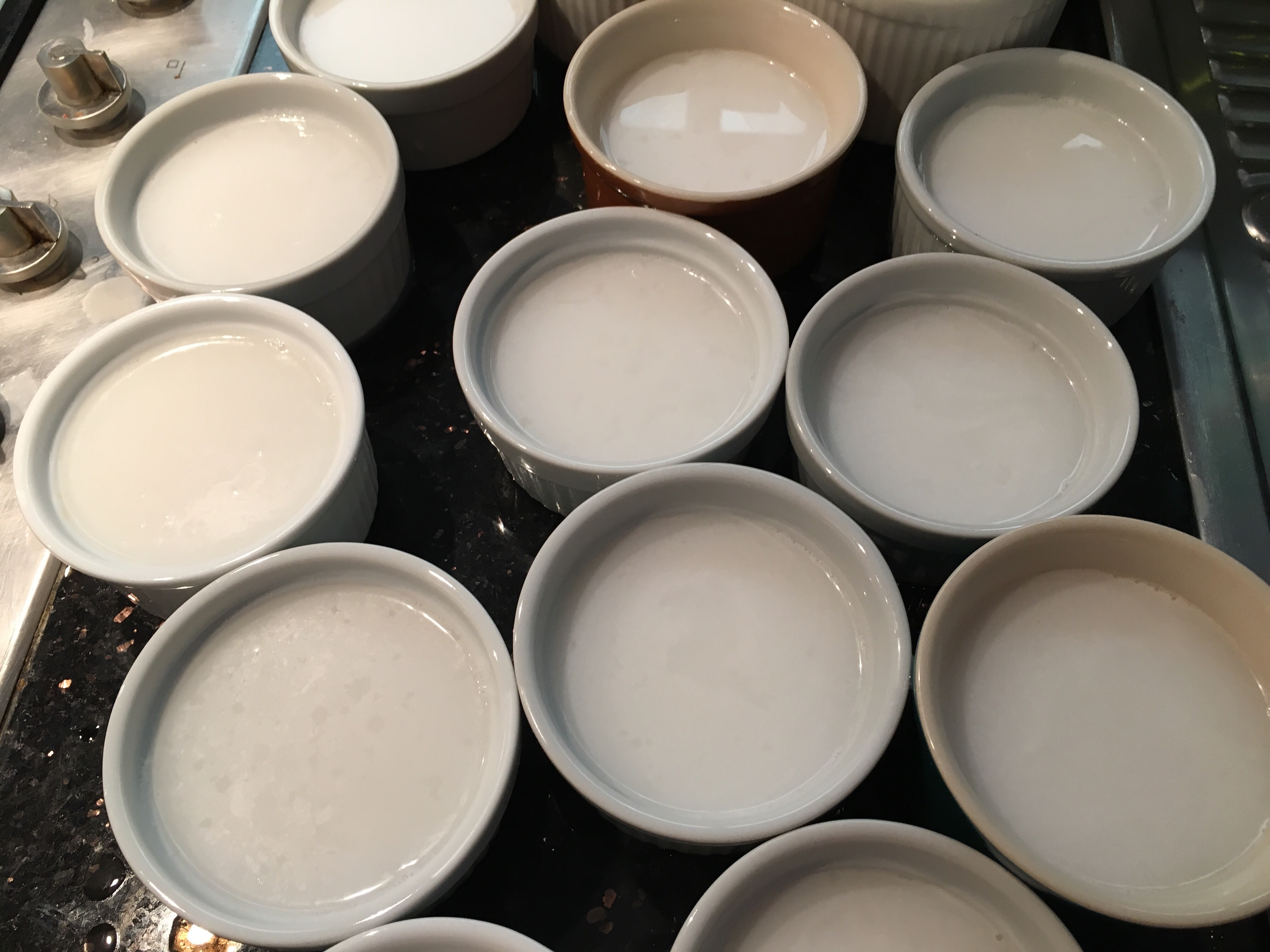 So then it’s a case of dissolving the agar in the juice . Cutting the young coconut pieces to decorate.