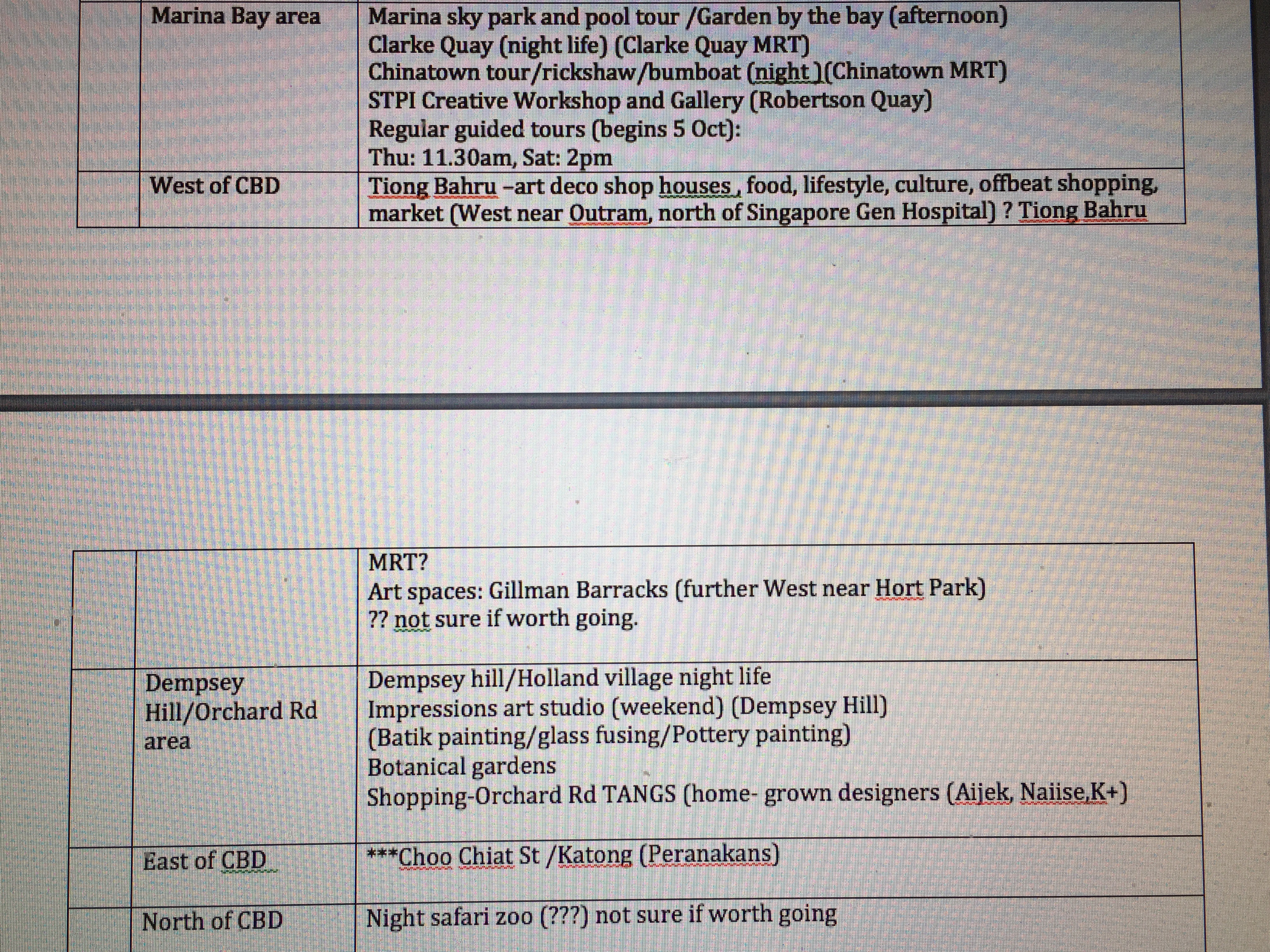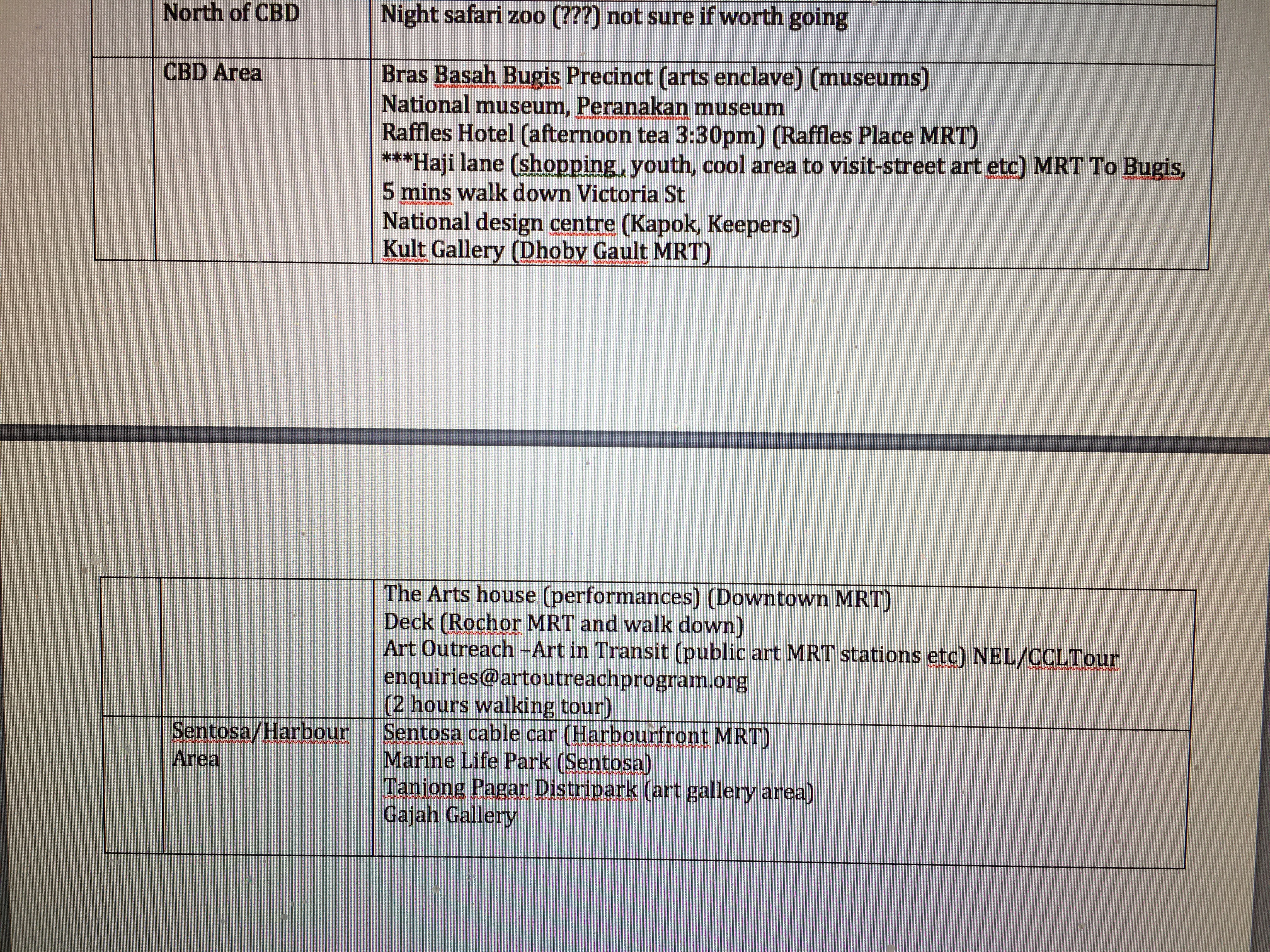 Managed to group my activities for Singapore into areas. That way we do an area a day. All is left is culling. Don’t think we can do them all on the 5 days.